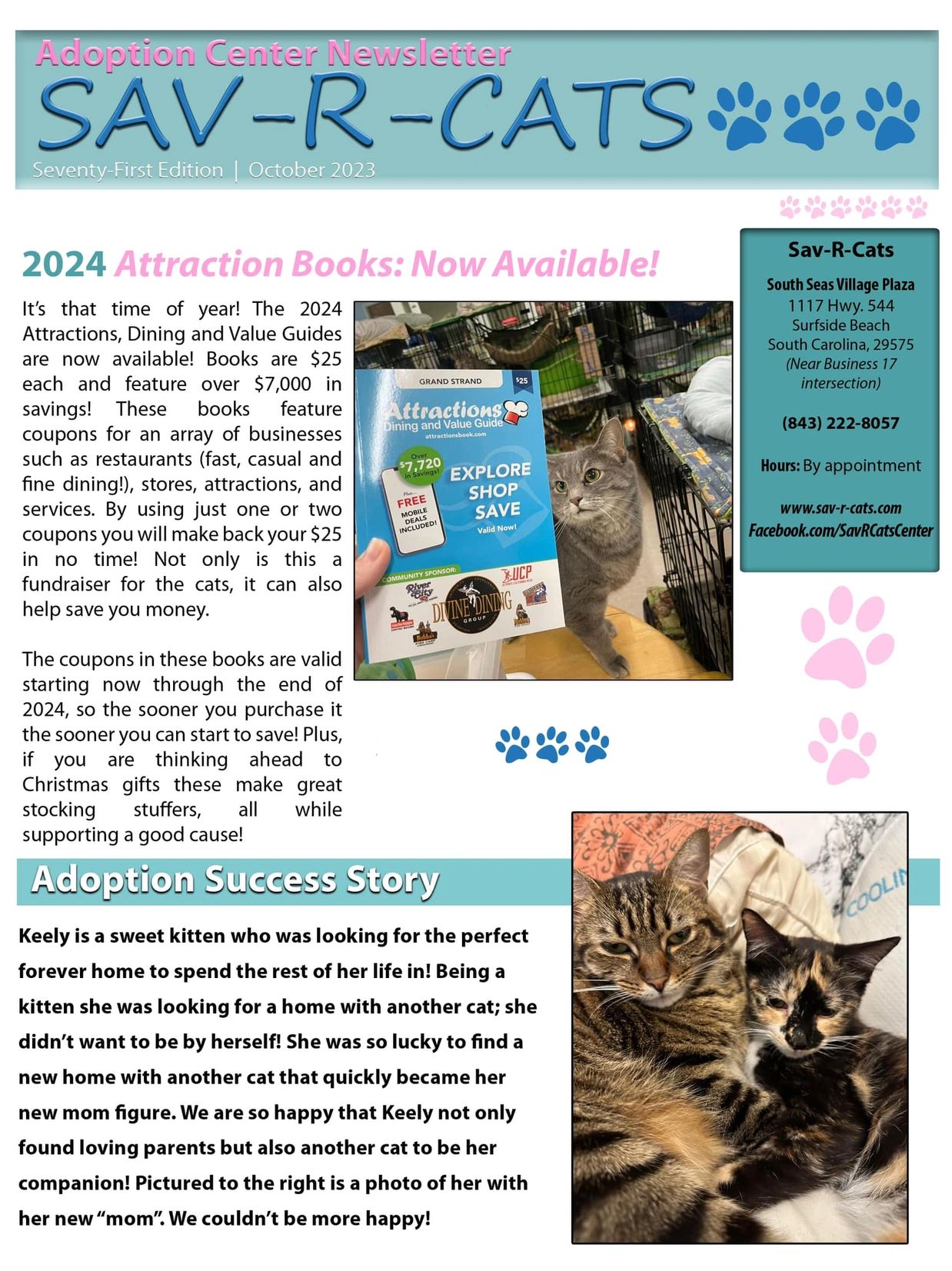 Sav-R-Cats is a local non-kill, cat shelter. One of our neighbors, Ursula Wiltsie, is a volunteer there. She also helps to take care of the stray cats here in Island Green. Sav-R-Cats International, Inc. was founded in 2002 as a non-profit organization whose primary goal is to ensure the protection, safeguarding and humane treatment of cats. To accomplish that goal, they depend entirely on the contributions of cat lovers and caring individuals and groups. The shelter incorporates a variety of ways to support their cause. They accept monetary donations, supplies, goods, recyclable items, and they sell Entertainment Books. The Grandstrand Entertainment book is published annually with over $7,000 in savings for local businesses. At the cost of $25, you'll make your money back in two purchases! These are a must for every household and are great as gifts! These are available for sale at the shelter, or contact Ursula for delivery!